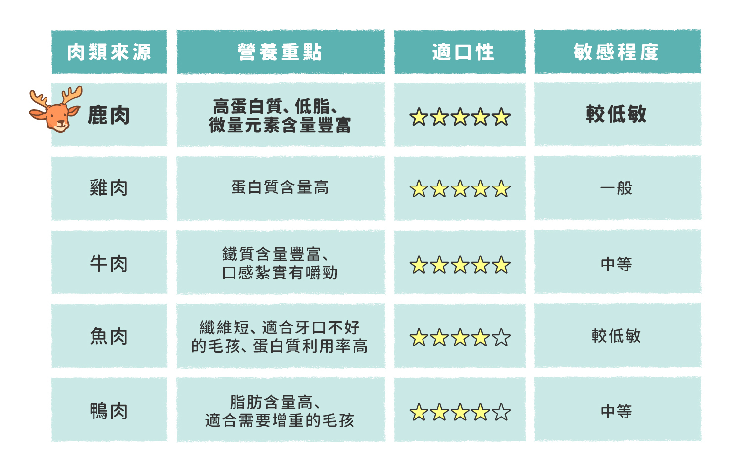 較低敏:鹿肉的飼養通常以小規模飼養為主,採用飲食較接近天然模式,通常也讓最終肉源較為純粹乾淨!對於對常見禽肉(雞、鴨)過敏的毛孩也極為友善。