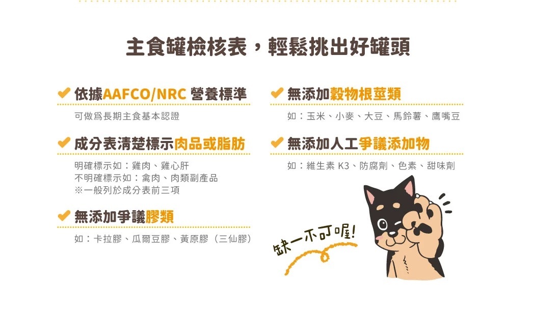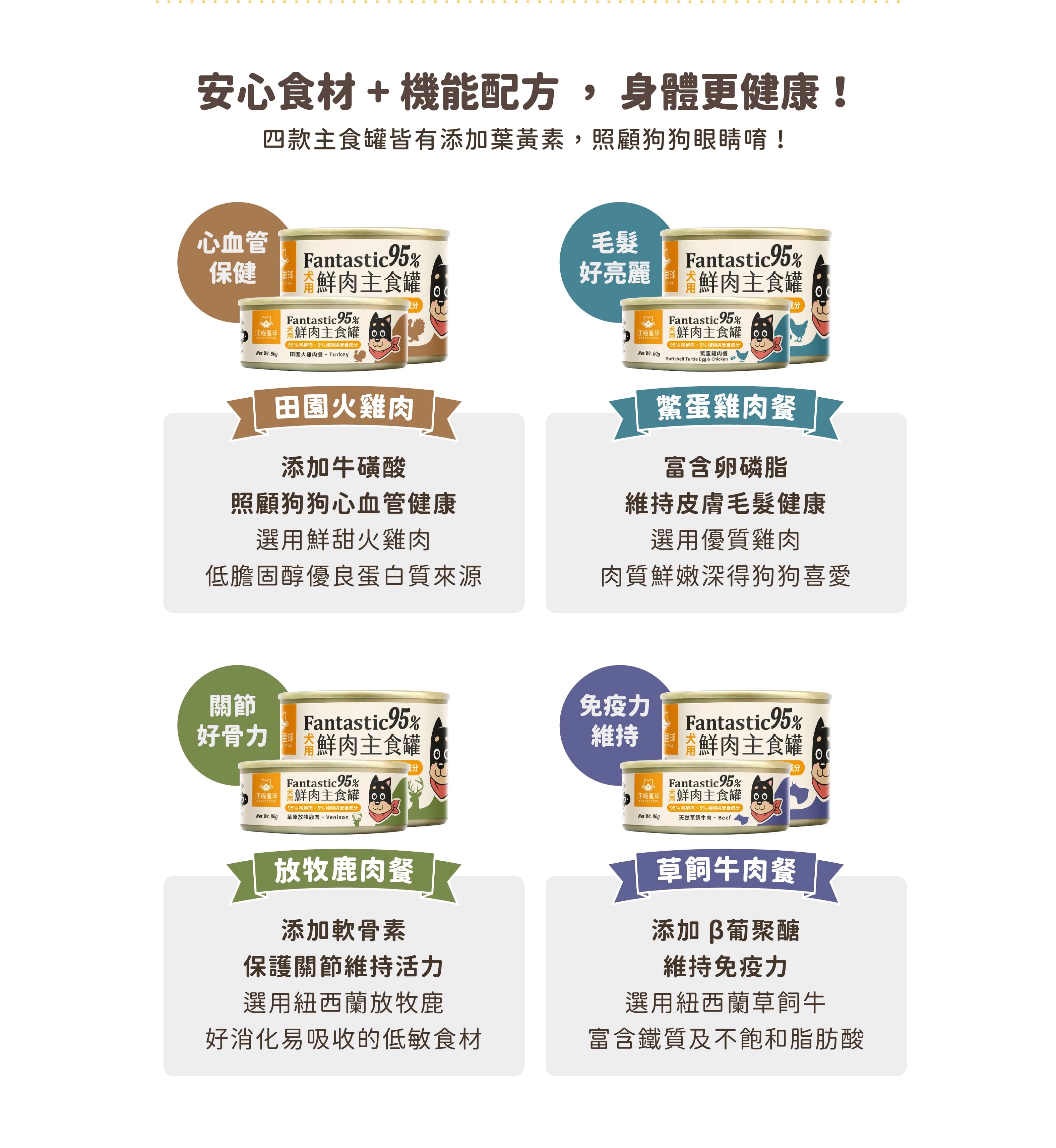 火雞肉、雞心肝、雞軟骨、雞蛋黃、天然魚油(富含Omega-3 DHA&PA)、地瓜、蔓越莓、海藻、磷酸鈣、碳酸鈣、維生素(維生素B群、維生素E、維生素D)、綜合礦物質、牛磺酸、葉黃素