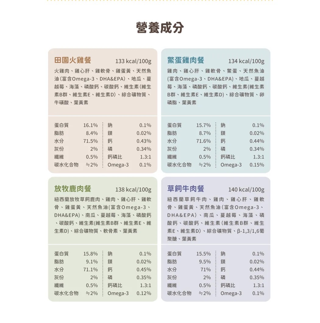 紐西蘭草飼牛肉、雞肉、雞心肝、雞軟骨、雞蛋黃、天然魚油(富含Omega-3、DHA&EPA)、南瓜、蔓越莓、海藻、磷酸鈣、碳酸鈣、維生素(維生素B群、維生素E、維生素D)、綜合礦物質、B-1,3/1,6葡聚醣、葉黃素