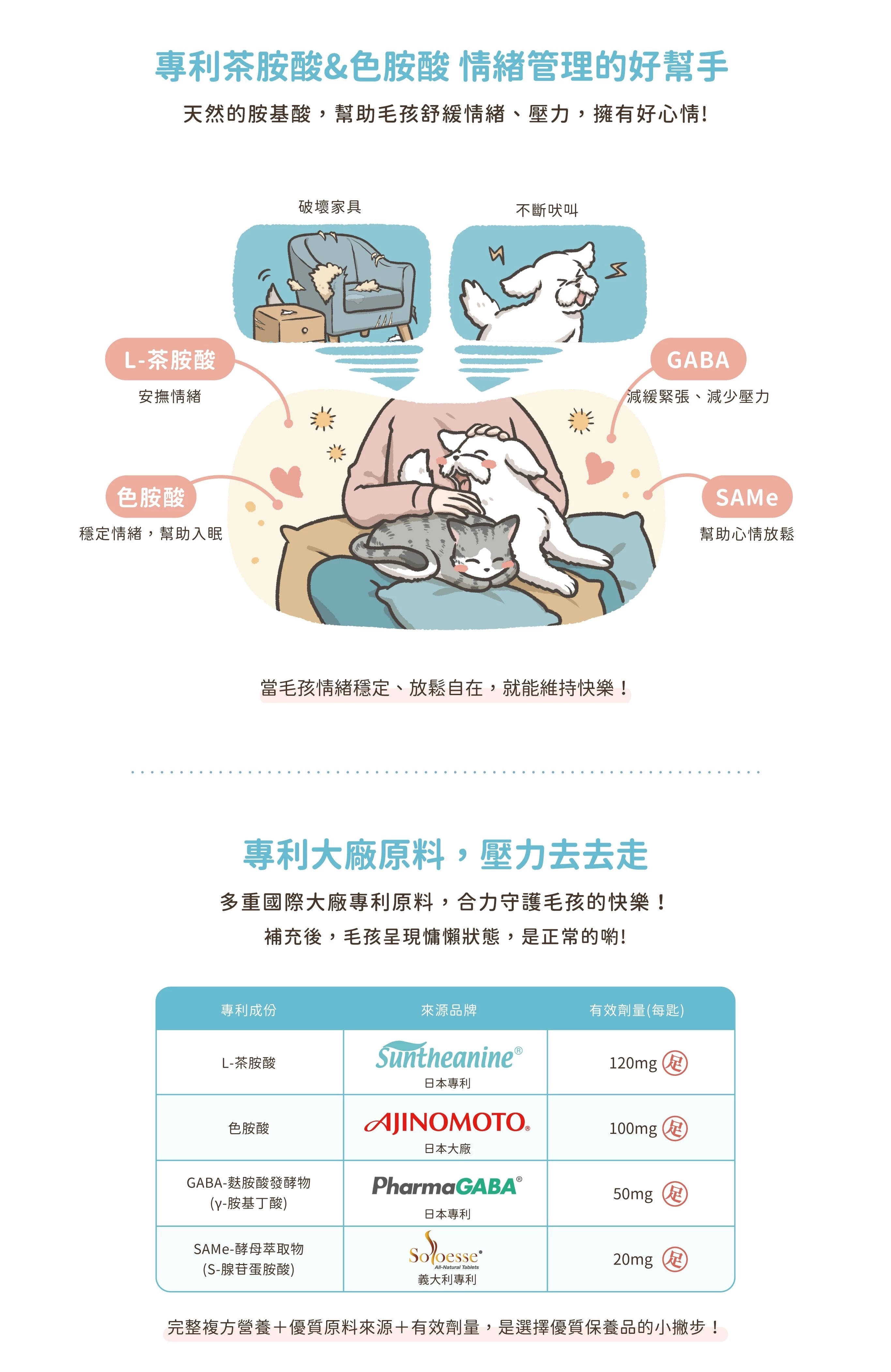 • 嚴選國際專利成分與複方設計,透過天然胺基酸,幫助毛孩舒緩壓力!