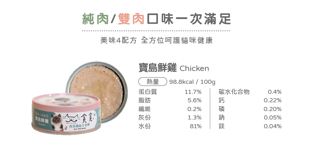 4種口味:寶島鮮雞、鮪魚&虱目魚、牛肉&雞肉、鮭魚&雞肉