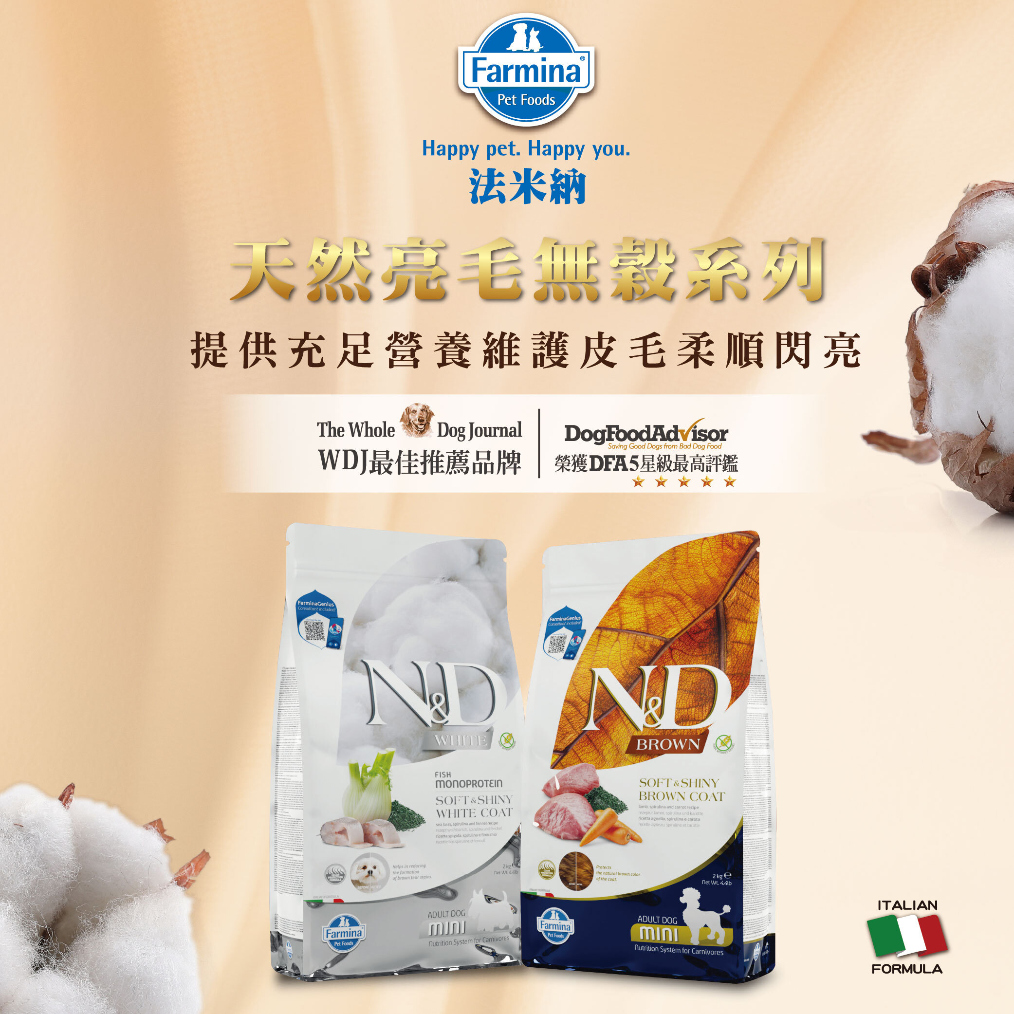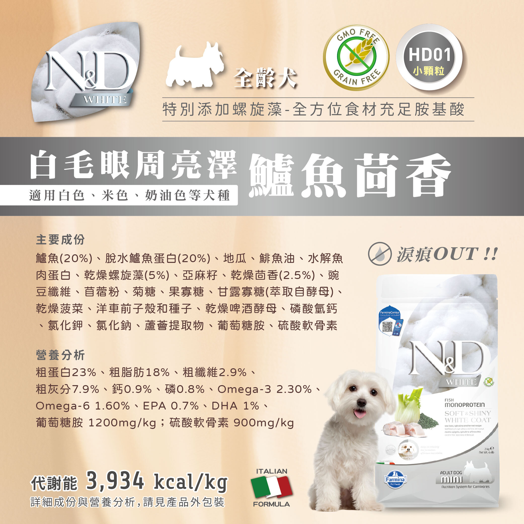 ✓寵物專家推薦,Farmina法米納HD01天然亮毛無穀犬糧,