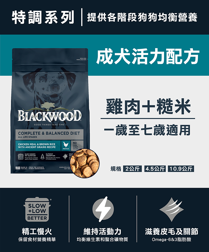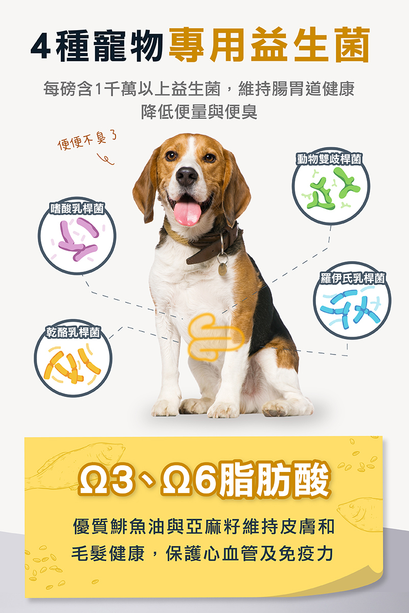 粗蛋白質24.0%以上,粗脂肪14.0%以上,粗纖維4.0%以下,水分10.0%以下,Ω6脂肪酸2.5%以上,Ω3脂肪酸0.4%以上,總益生菌數1千萬CFU/磅以上