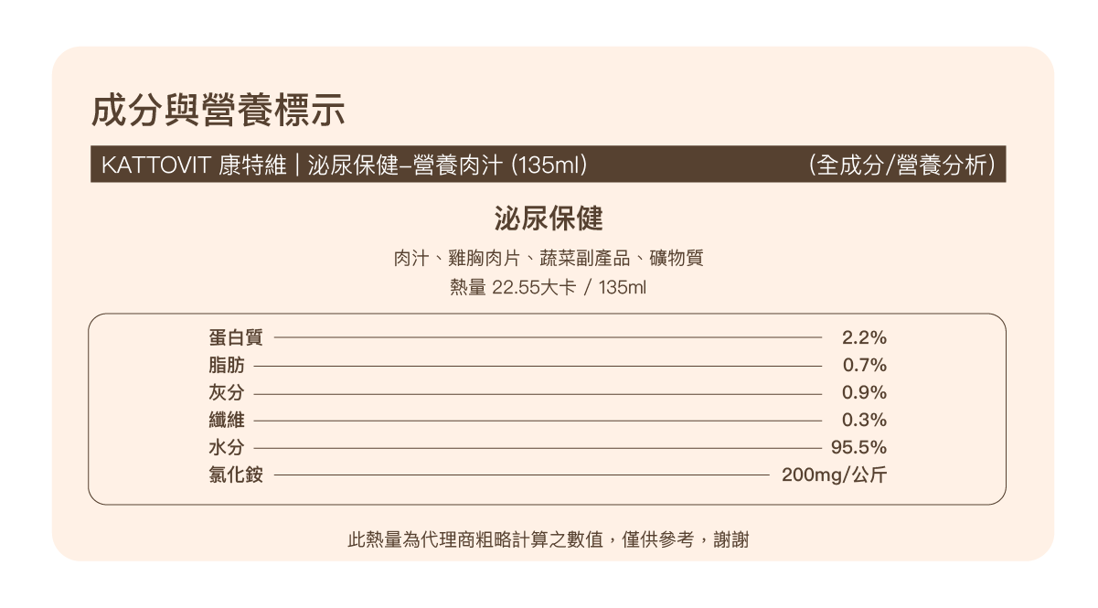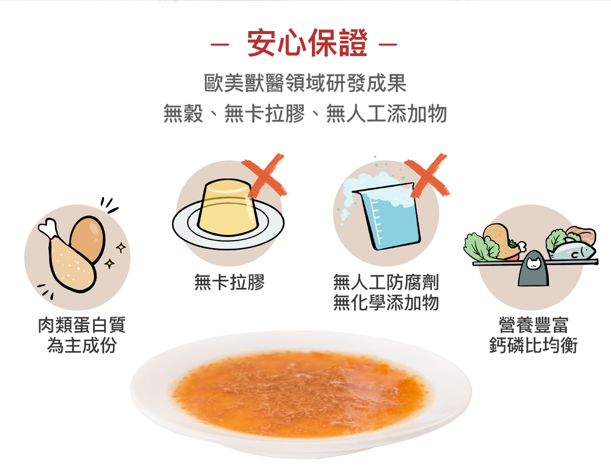 肉湯、雞胸肉,礦物質,蔬菜副產品(包括0.25%果寡糖)。
